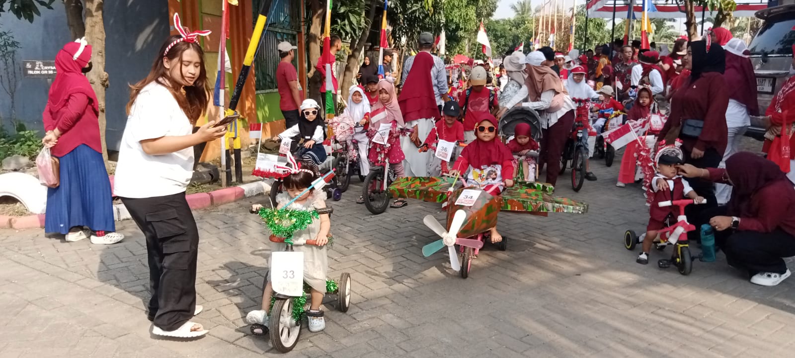 Peserta karnaval menampilkan sepeda-sepeda hias dengan tema yang kreatif dan unik. Beberapa di antaranya berbentuk tank, pesawat tempur, hingga kapal bajak laut, menunjukkan imajinasi dan semangat kebersamaan warga. Anak-anak hingga remaja terlihat bersemangat mengayuh sepeda mereka sambil diiringi sorak-sorai dan tepuk tangan penonton.